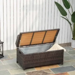 This 2 in 1 function Outsunny garden storage box with a bench seat top is the ideal solution for storing garden toys, tools and supplies as well as taking a well earnt break on the bench. Constructed from a high-quality aluminium frame and wrapped in PE rattan this garden storage box is durable, weather resistant and will last for years to come. With a built-in hydraulic lifting system this garden storage box is easily opened and closed. The wide seat is ideal for you and a friend to relax in the comfort of your own garden. The wood top finish really gives this garden storage box a unique look and will compliment your outdoor living space perfectly.