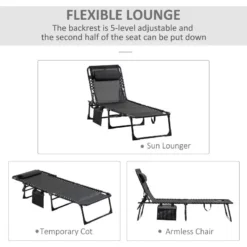 Check out this stunning Outsunny garden sun lounger that we can be sure will compliment your outdoor living space perfectly. Constructed from a powder coated metal frame and curved arm rests, this sun lounger is strong, durable and will last for years to come. Covered in washable PCV sling fabric that allows air to circulate and keeps you cool on warm summer days, it is also easily cleaned with a damp cloth. Sit up to read a book or recline the back over 5 levels to sunbathe in the comfort of your own garden, the added head rest pillow will keep you supported for hours on end. This sun lounger is also lightweight which allows you to easily manoeuvre to your preferred position of your garden and can be folded for easy storage when not in use. Finished off with a handy side pocket that is ideal for keeping your phone and book accessible and secure. If you are looking for a beautifully designed sun lounger, this is the one for you.