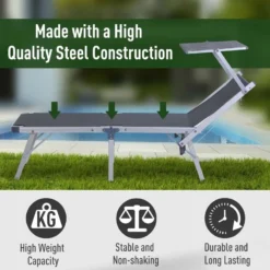 Check out this stunning Outsunny garden sun lounger that we can be sure will compliment your outdoor living space perfectly. Constructed from a powder coated metal frame and covered in a sling fabric, the lounger is strong, durable and will last for years to come in the weather elements. The sling fabric circulates air that keeps you cool on warm summer days and can be cleaned with a damp cloth. Sit up to read a book or use the reclining function to lay back and relax in the comfort of your own garden for hours on end, complete with the added shade to protect your eyes from the sun. The folding design allows you to manoeuvre the sun lounger to your preferred position around your garden and is easily packed away when not in use. If you are looking for a beautifully designed sun lounger, this is the one for you.