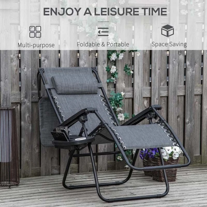 Check out this stunning Outsunny garden sun lounger that we can be sure will compliment your outdoor living space perfectly. Constructed from a powder coated metal frame, plastic arm rests and covered in a sling fabric, the lounger is strong, durable and will last for years to come in the weather elements. The sling fabric circulates air that keeps you cool on warm summer days and can be cleaned with a damp cloth. Sit up to read a book or use the reclining back and footrest function to lay back and relax in the comfort of your own garden for hours on end, complete with the added shade to protect your eyes from the sun and head rest pillow for ultimate support. The handy side table with holes for your drinks, book and phone is ideal for keeping your things close and secure. The folding design allows you to manoeuvre the sun lounger to your preferred position around your garden and is easily packed away when not in use. If you are looking for a beautifully designed sun lounger, this is the one for you.