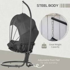This Outsunny egg chair is a great addition to your outdoor or indoor space. The retractable canopy, curved back, spacious seat and soft cushion offer a comfortable sitting experience. The hanging stand is crafted from steel making it strong, with a large base for balance. Easy to store with a foldable seating basket, space-saving, and convenient. A great way to relax and unwind whenever you want.