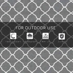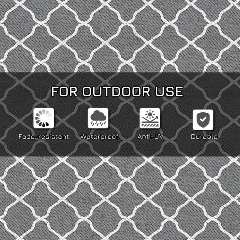 Enhance your outdoor experience with the Outsunny Waterproof Outdoor Rug. This versatile garden rug is perfect for camping, picnics, festivals, or simply relaxing in your garden. Its foldable design allows for easy portability and storage. Made from durable and water-resistant material, it withstands outdoor use. The reversible design provides the option to use both sides, extending its lifespan. With a protective coating, it resists sun fading and damage. The outdoor carpet comes with corner straps and ground nails for secure placement. It includes a convenient carry bag for safe transportation. Create a cozy and stylish outdoor space with this functional and practical outdoor rug.