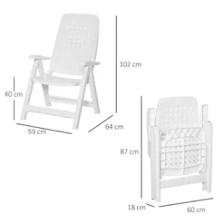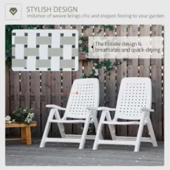 This set of 2 Outsunny four-position PP chairs is a great way for you and your partner to relax outdoors while reading, sunbathing or just taking a rest. The easily adjustable four-position mechanism provides the comfort of lying down in your favourite posture. The hollow design on the back and seat add the look and also helps with quick drainage on rainy days. The full plastic frame is lightweight and water and dust-resistant making it last for years. This set of 2 folding chairs is versatile enough to serve you as dining chairs, and camping chairs. Easy to store and carry allowing it to be taken on trips with you.