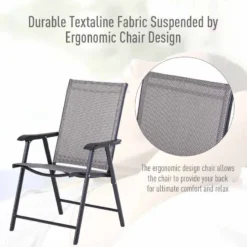 This Set of 2 Outsunny Foldable Metal Garden Chairs is a perfect choice for your garden or to take on the trip with you and enjoy the views comfortably while sipping your beverage. The frame is crafted into a classic outdoor chair style for simplicity. The textilene seats allow your skin to breathe making it ideal for hotter days. With a tall, slightly tilted back, wide seat, and mid-rise armrests, each chair allows comfortable support for long periods. The metal is powder coated providing extra strength and durability.