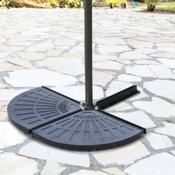 This pair of Outsunny garden parasol umbrella bases will keep your parasol umbrella secure and stylish. Each base is meticulously constructed from resin and has a bronze-tone plastic covering for long-lasting performance. The elegant, engraved fan pattern gives a touch of refinement to your outdoor space, complementing any style of garden furniture. These bases efficiently weigh down your parasol umbrella, ensuring that it remains steady and safe throughout the day. The image shows a stand that is not included.