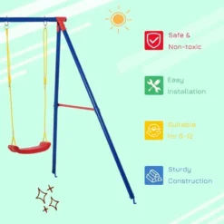 This Outsunny single swing set for kids provides instant fun space for any backyard, garden, or park. Height-adjustable durable ropes suit users of different ages. The metal frame, made into an βAβ shape provides full support and balance with ground stakes. Powder coating helps prevent rust and excessive heat buildup. Finished with a ‘U’ shaped seat so they can sit safely and comfortably. Suitable for ages 6-12 years. This Outsunny swing set is an exciting and safe way to keep kids active, whilst they enjoy themselves.